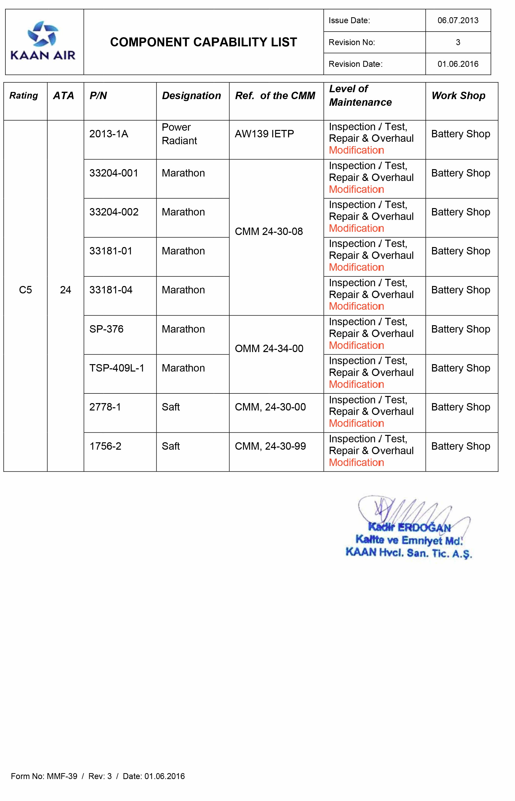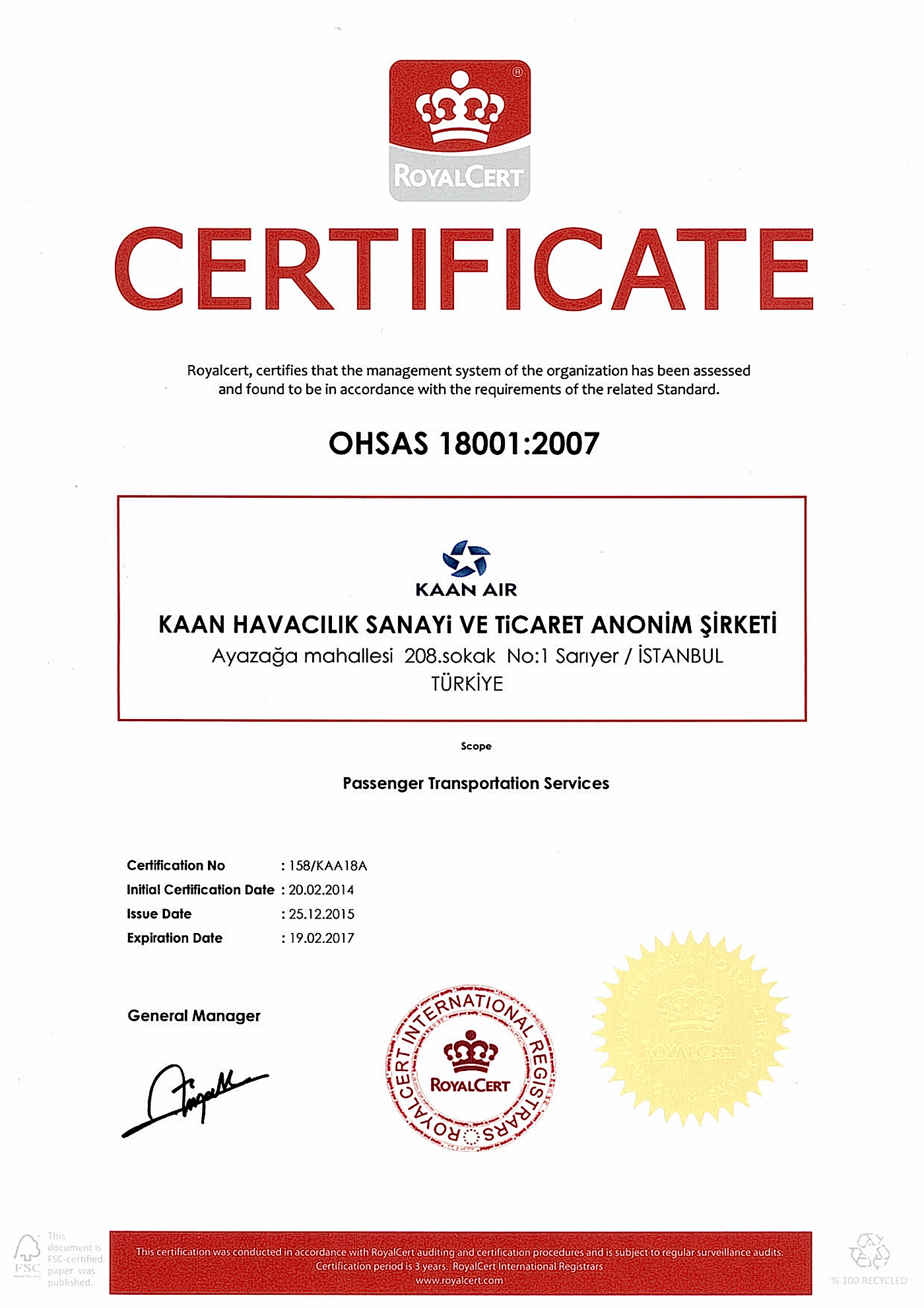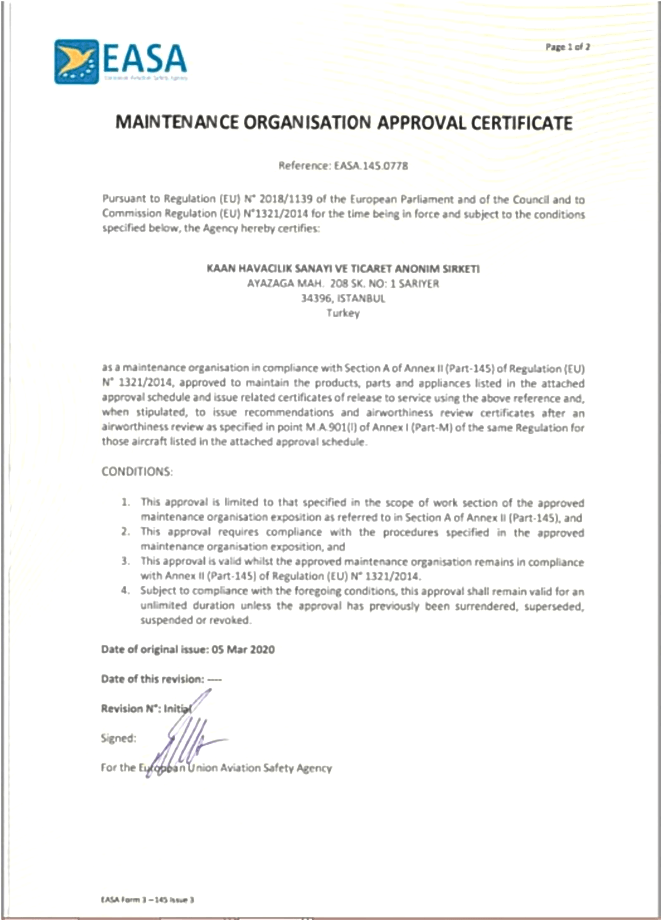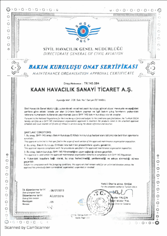 SHY – 145 onaylı Bakım Kuruluşu sertifikası